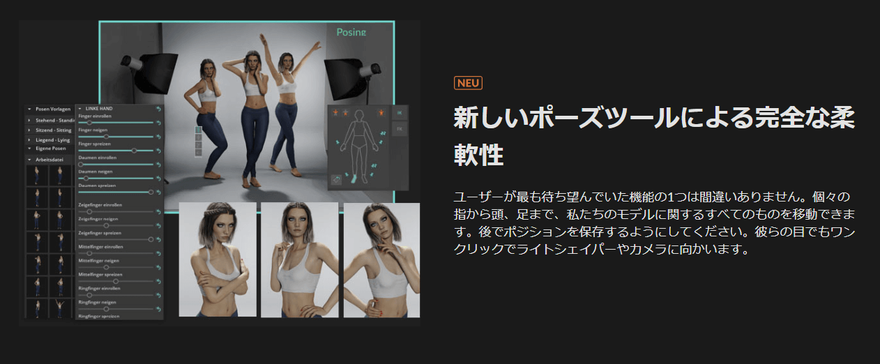 また新しく搭載されたポージングモードに関してはかなり自由にからだの動きを設定できるようになっているので